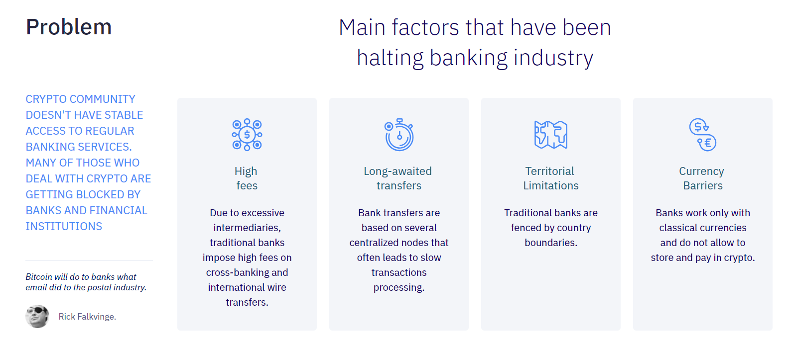 Currently, we can notice a number of shortcomings in the field of banking services. These are the existing intermediaries in the supply of these services, which is expressed in money costs for transfers (commissions). In addition, some banks are restricted by bans on international transfers with banks in certain countries. It is also worth mentioning about the speed of Bank transactions, which are sometimes delayed up to several days and the limitations of the crypto currency, as banks are not able to process transactions related to the crypto currency.