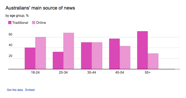 Yet how we access the news in this digital age is now coming a fundamental part of how we shape our opinions. As a population we are coming more aware that their are a multitude of sources out there when it comes to opinion pieces and political information. The graphs below show a shift in attitude, but more importantly show that online media is becoming a go-to source for younger generations, with traditional media falling out of use.