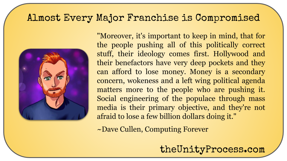 "Moreover, it's important to keep in mind, that for the people pushing all of this politically correct stuff, their ideology comes first. Hollywood and their benefactors have very deep pockets and they can afford to lose money. Money is a secondary concern, wokeness and a left wing political agenda matters more to the people who are pushing it. Social engineering of the populace through mass media is their primary objective, and they're not afraid to lose a few billion dollars doing it."