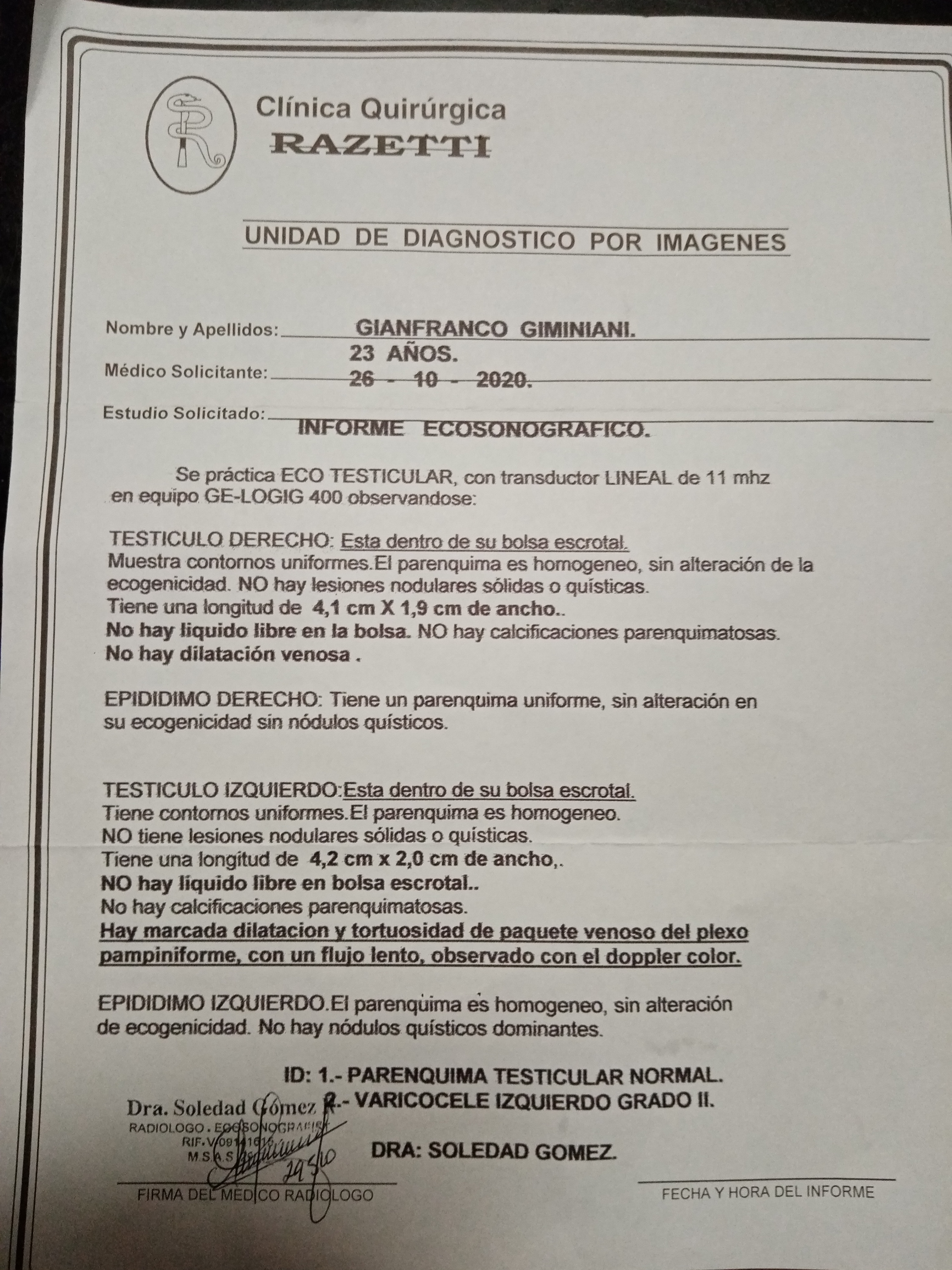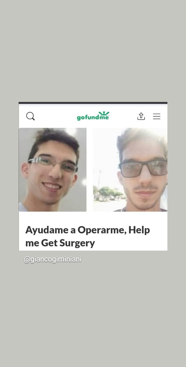Hola, mi nombre es Gianfranco Giminiani y tengo 23 años, vivo en Ciudad Guayana, Estado Bolívar, Venezuela. Pido tu apoyo por este medio ya que padezco de varicocele grado II (el varicocele que es una varice que se puede encontrar en el testículo y puede causar tanto impedimento como una hernia) y amerito una intervención quirúrgica, la cuál no puedo solicitar en algún hospital por la situación actual del sistema de salud nacional, el cual es disfuncional, debido a la situación económica y social que atraviesa mi país. Es por esto que, necesito acudir a clínicas privadas donde el costo de la operación exceden mis posibilidades. Actualmente, soy el único sustento económico en mi hogar, pero, a causa de mi estado actual, se me imposibilita trabajar, ya que el cargar peso y estar mucho tiempo de pie, resulta ser perjudicial y ocasionaría daños de mayor escala. Por favor, pido tu colaboración para recaudar los fondos necesarios para operarme y continuar colaborando en mi hogar. Muchas gracias de antemano.