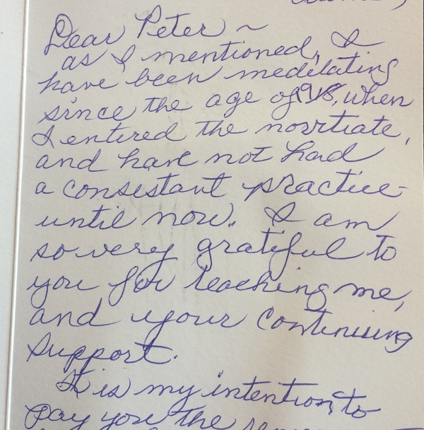 As I mentioned I have been meditating since the age of 19, when I entered the novitiate [nun], and have not had a consistent practice until now. I am so very grateful to you for teaching me, and your continuing support.