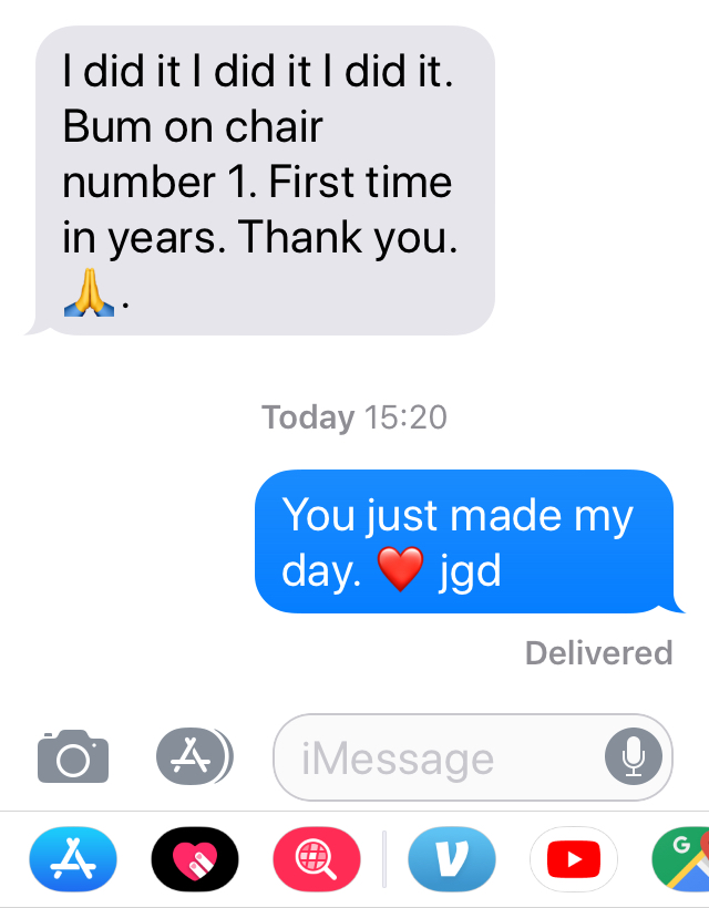 This delightful lady learned many years ago but life sometimes gets in the way. She reached out to me to help her back on track with her meditation and then she made my day.
