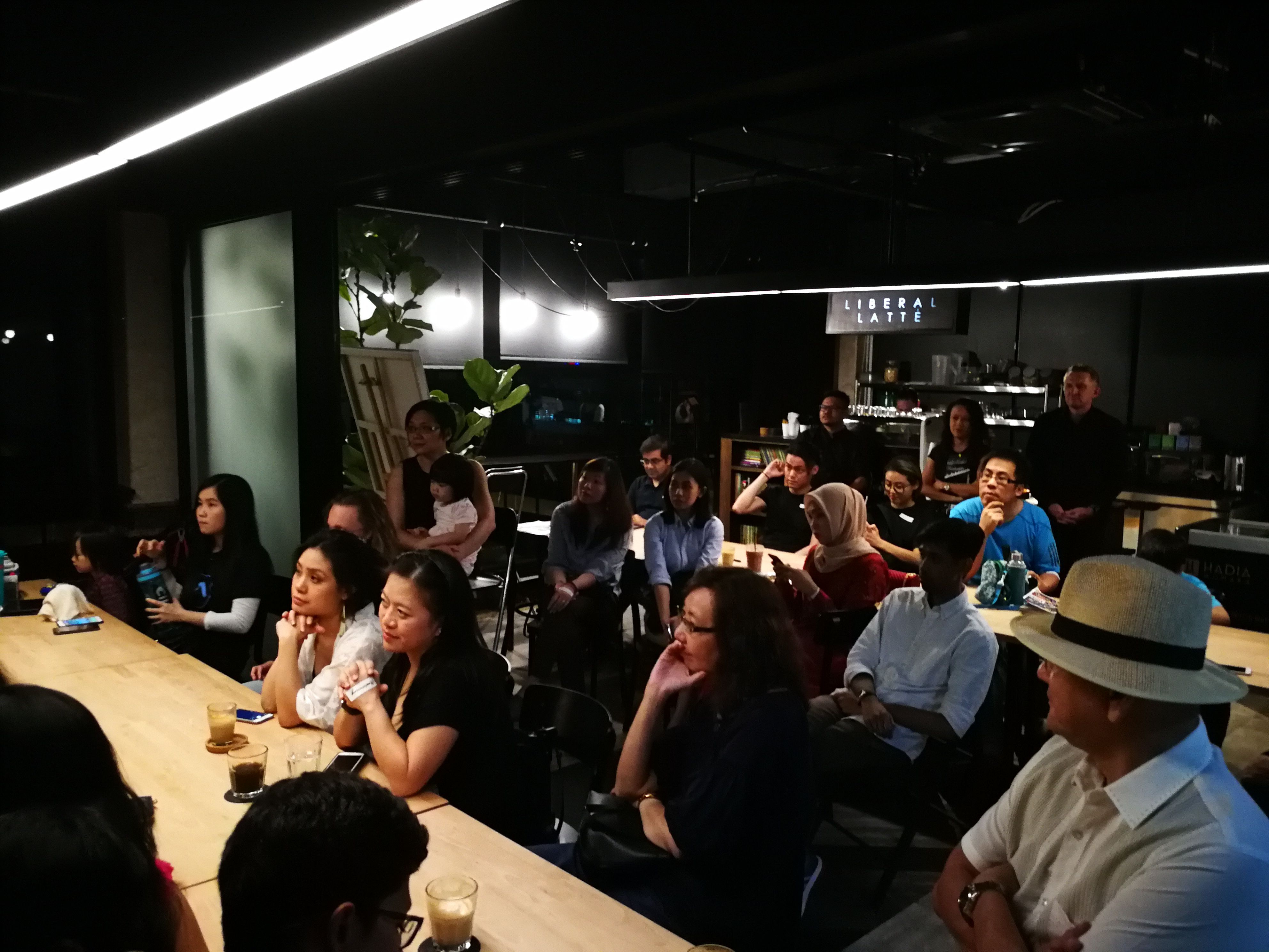 The focused crowd at another angle with one of the audience raising her hand asking @perennial questions about the topic of the evening.
