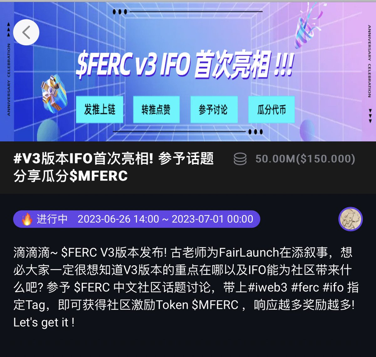 #ferc #iweb3 #ifo one7monkey (56)in Meme fair ERC-20 • 3 years ago #ferc #iweb3 #ifo Wh3话题活动开启,参与话题活动增加挖矿收益! 每次发推带上#ifo即可参与活动! @FERC20CN @wormhole_3 @Ferc20Global #ferc #iweb3 #ifo
