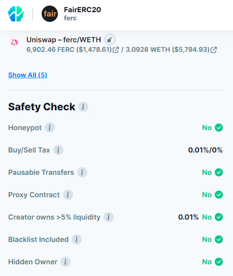 A Safety Check for FERC bysotzseky (60)in Meme fair ERC-20 • 3 years ago A Safety Check for FERC by Coin Brain No Honeypot 🟢 0.01%/0% Buy/Sell Tax 🟢 NoPausable Transfers 🟢 NoProxy Contract 🟢 Creator owns >5% liquidity 0.01% No 🟢 NoBlacklist Included 🟢 NoHidden Owner 🟢 #ferc #iweb3