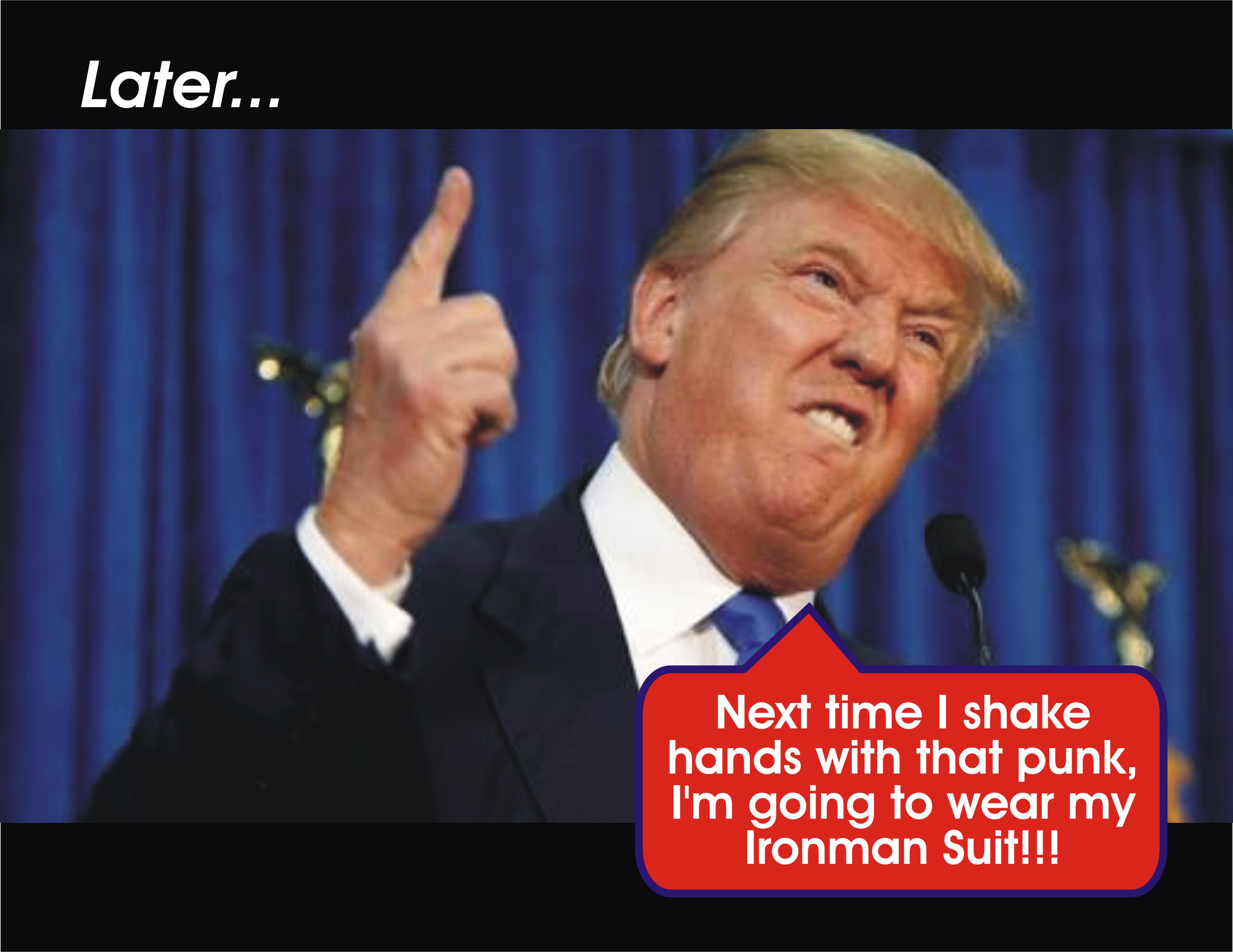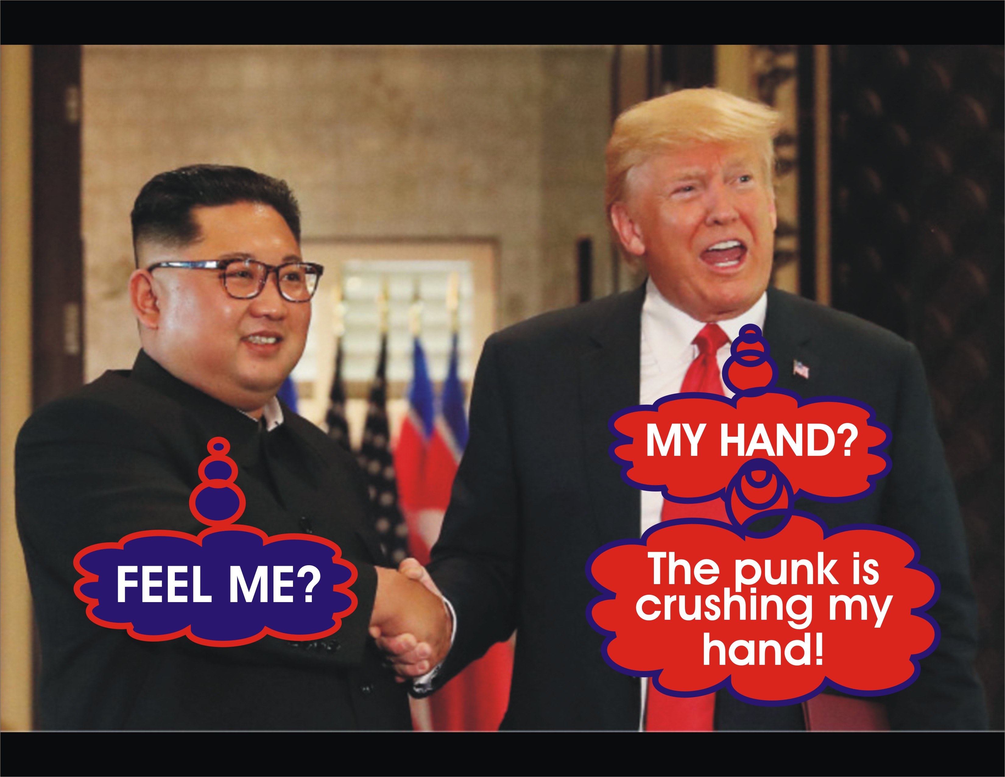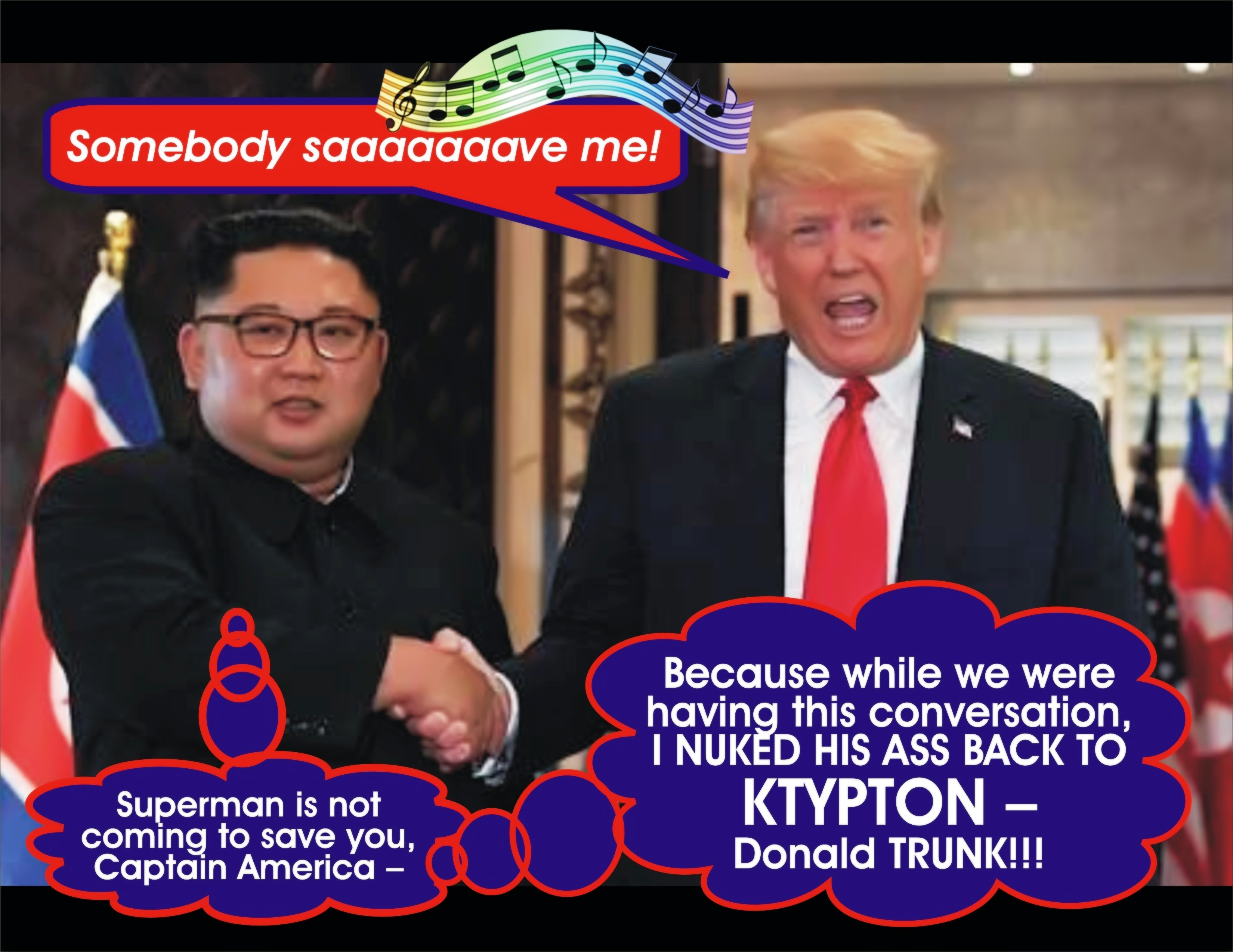 And let's just say, also for crying out loud, that we are observing the Alternate Versions of Jong and Trump in the Alternate Realm of MEMEopolis, congratulating themselves after a hard job well done -- averting the 3rd World War, that is -- the following series of meme contain how their conversation may likely flow: