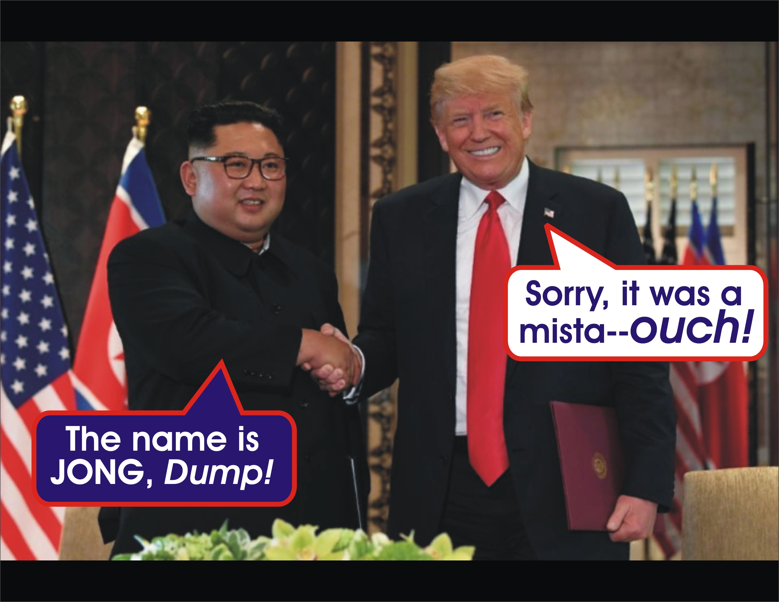 Luckily Donald Trunk -- sorry! I mean Trump, didn't mention anything about throwing a nuke at Jong for crushing his hand...