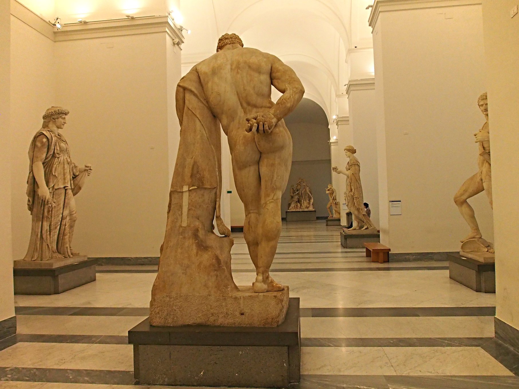 나폴리 국립 고고학 박물관에는 파르네세 헤라클레스라는 조각품이 있다. 기원전 4세기 그리스의 리시포스가 만든 조각상을 글리콘이 모각한 작품이다. 본래 조각상은 로마의 카라칼라 욕장에 세워져 있었다. 후에 방치됐던 것을 파르네세가 나폴리로 옮겨 오자 파르네세 헤라클레스라고 불리게 된 것이다. 쉬고 있는 모습의 헤라클레스는 당시 이곳을 찾은 로마인들에게 편안한 쉼을 선사해 주었을 것이다. 헤라글레스가 뒤로 돌린 오른손에는 헤스페리데스의 황금사과 세 알이 들려 있다. 그리고 왼손으로 감싸고 있는 것은 올리브 몽둥이와 그가 잡아 죽인 네메아의 사자 가죽이다.
