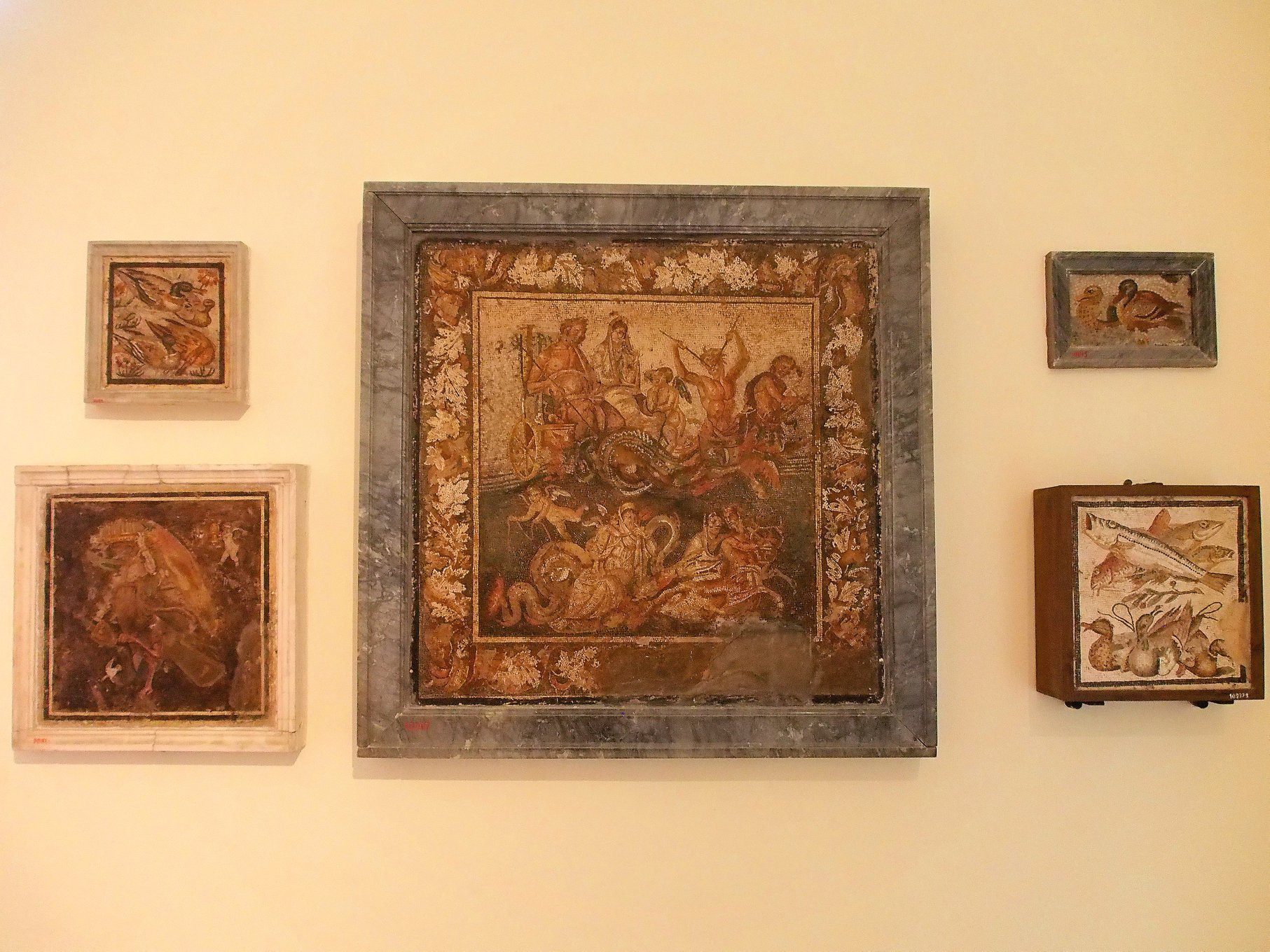 이집트 전시관은 보르자 추기경의 컬렉션 등 여러 수집가들에 의해 18-19세기 사이에 수집된 것이다. 그 중에는 ‘아기의 엄마’라 불리는 오래된 미이라가 있다. 모자이크 작품으로는 폼페이에서 출토된 여인의 초상과 오리, 물고기, ‘포세이돈과 암피트리테의 전차 결혼식’ 등의 작품이 있는데 박물관에서 가장 유명한 것은 ‘알렉산더 대왕과 다리우스 3세의 이수스 전투’를 묘사한 모자이크다. 길이 16피트 넓이 8피트의 이르는 거대한 모자이크 역시 폼페이에서 출토된 것이다.