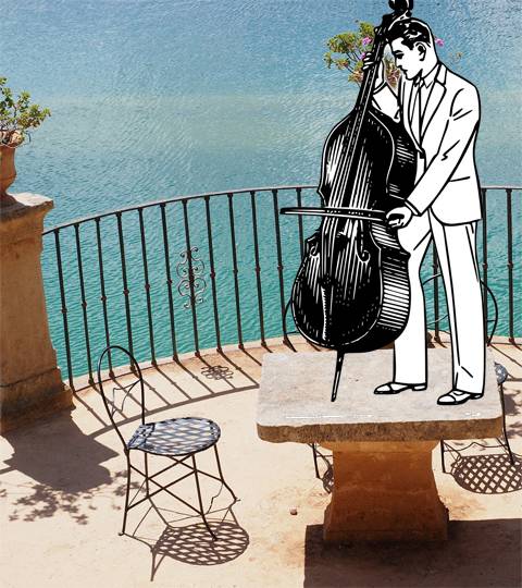 A saint kid with a halo stands on a terrace and hits small nova baseballs with his bat down to the beach below while a bass player plays music for him. His holiness is only shine: he is a knave!
