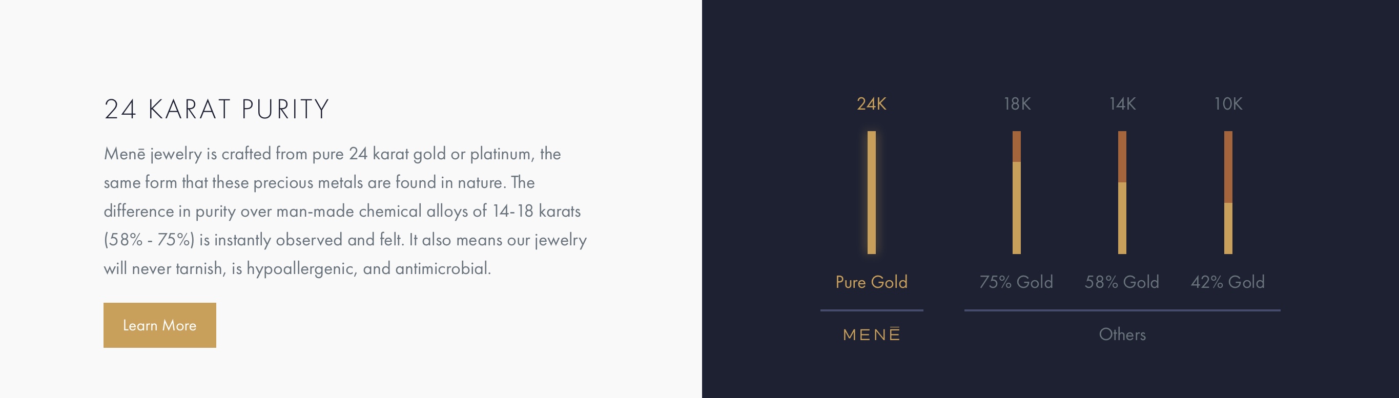 Menē crafts 24 karat gold and platinum investment jewelry™ that is transparently sold by gram weight. By combining innovative technology with timeless design, Menē restores the ancient tradition of jewelry as a store of enduring value.