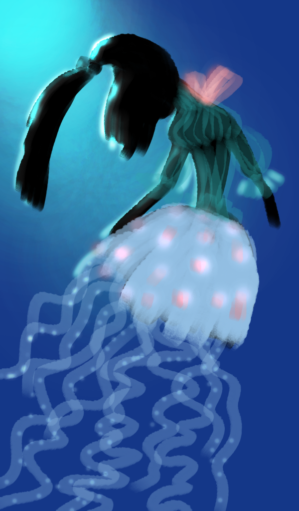 I made a ballerina mermaid floating like a feather deep down the dark blue sea. Her tutu is made out of a big jellyfish which also forms her lower extremity instead of a fish tail. The jellyfish part is very luminous and fluid making it possible for the mermaid to swim, dance and play despite the darkness.