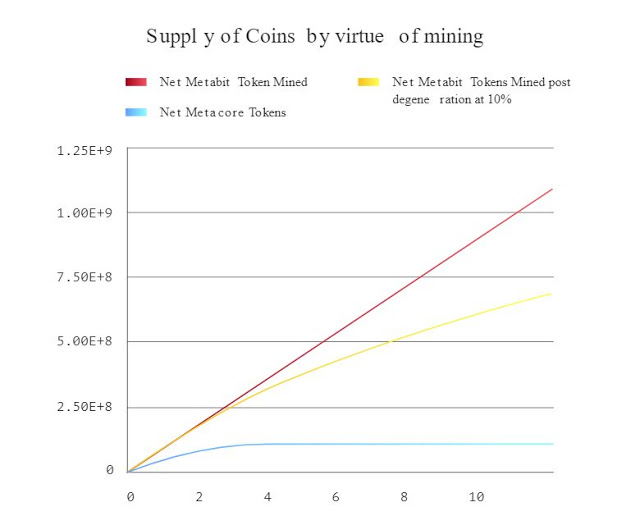 Based on supply of Metabit and Metacore, there is a rate of exchange derived between both tokens. All transactions of Metabase have a static transaction cost in terms of Metabit, but when the rate of exchange is applied, the overall transaction cost is reducing in nature with respect to Metacore.