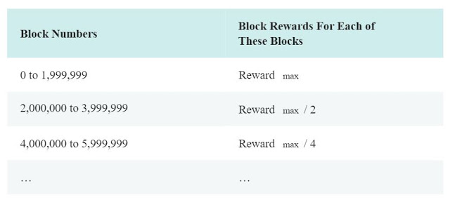 Block reward per block halves after every 2 Million Blocks, hence block rewards for different block numbers look as follows: