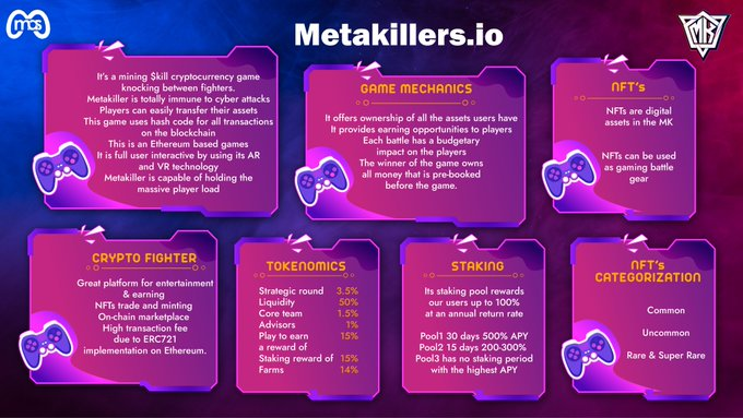 MetaKillers is a next generation prison action battle game based on blockchain and knocking between fighters. Play to Earn Game 15% of tokens allocated for gaming reward. 14% tokens allocated for yield farms and 15% reserved for staking pools which offers impressive APY. Note every single tokens either locked on pinksale or in staking contract for the sake of community safety and ensure price stability. Testnet version is live you can play and enjoy game.