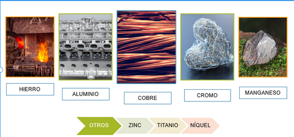 - Hierro: Elemento principal para la aleación de acero y los aceros son los de mayor uso a nivel industrial debido a su amplia gana e aleaciones con distintas prioridades, su interacción costo beneficio lo coloca en el metal mas usado a nivel mundial.