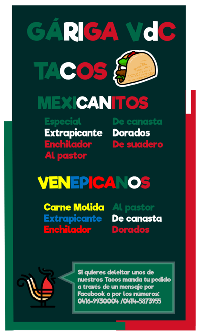 ¡Tacos! ¿Quién no quiere probarlos? Por eso te traemos nuestro menú con diversos tipos de esta magnífica comida. Solo prueba y verás que no veras el mundo como lo viste antes de probarlo ¡Y échale salsita! Agrégale a lo mejor ¡Lo mejor! Salsas con ingredientes únicos e inigualables, solo pide, pide y pide.