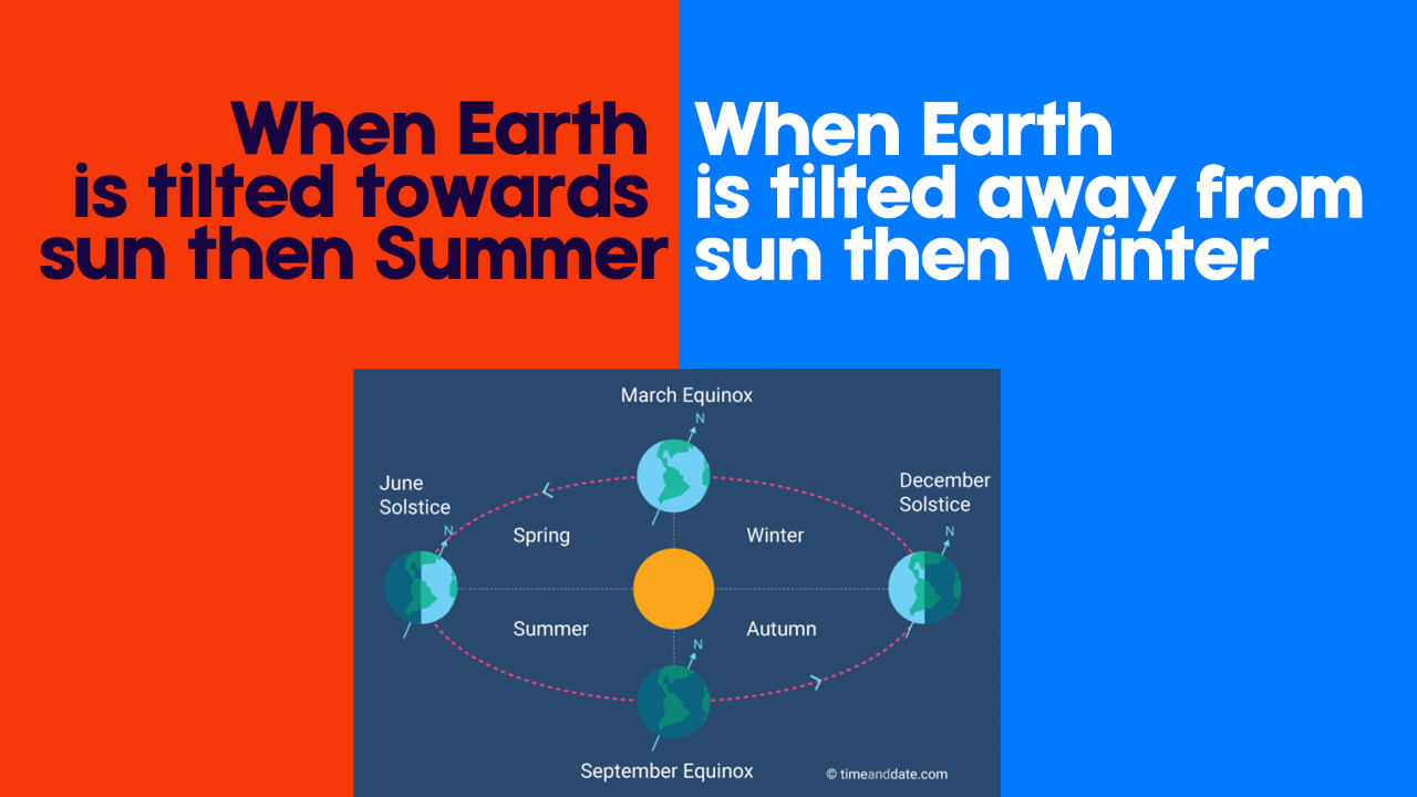 When northern hemisphere of earth tilted towards the sun , its rays strikes on northern hemisphere. Thus causes summer season due to increase in temperature in that region. When northern hemisphere points away from the sun , the sun rays fall slanting on it. This causes winter season due to decrease in temperature