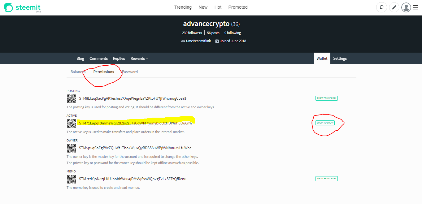 now you see page like image no. 7.2 in this page in 1st option fill your username and 2nd option fill your active key ( For find active key go to your steemit wallet > permission > login to show and copy active key like image no. 7.3 ) and click on sign in.