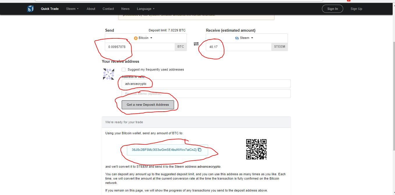 Step 5: Now you send #BTC given amount on given address. after successful Transactions you will get 40 steem in your steemit wallet. (Image 5)