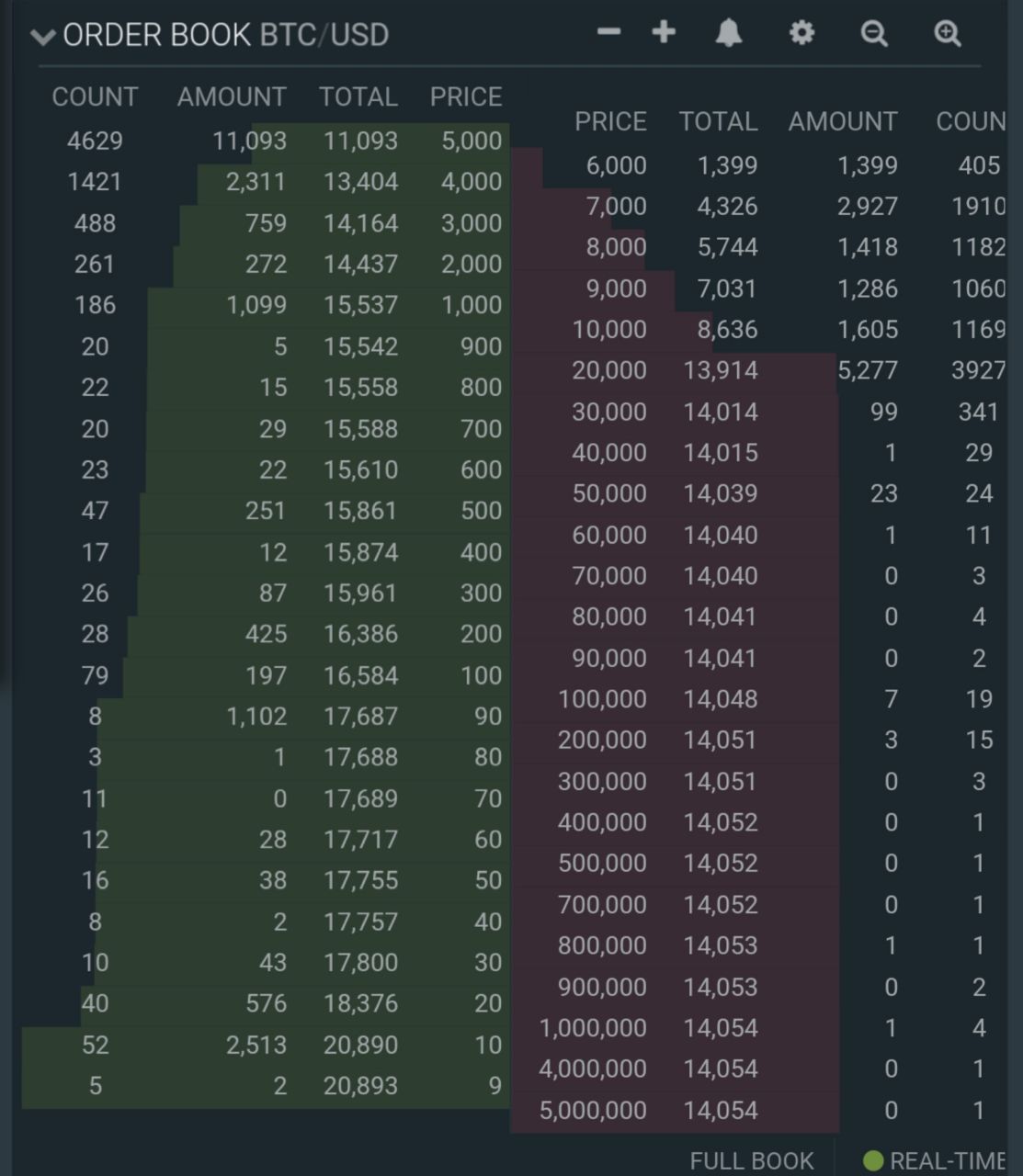 Almost same order book in bitfinex dump should be from now 700-800$ possible. There are 11000+ bitcon buy order in single exchange till 5000$ price and only 8600+ btc sell order till 10000$ price. Price manipulation by big whales who have thousands of Bitcoin they are making single green candle and dumping it in 15-15 minutes candle to frustrate people's because they want to get btc as much as possible for the next bull run. Reversal can happen from 5500$ or From 5200$-5300$.