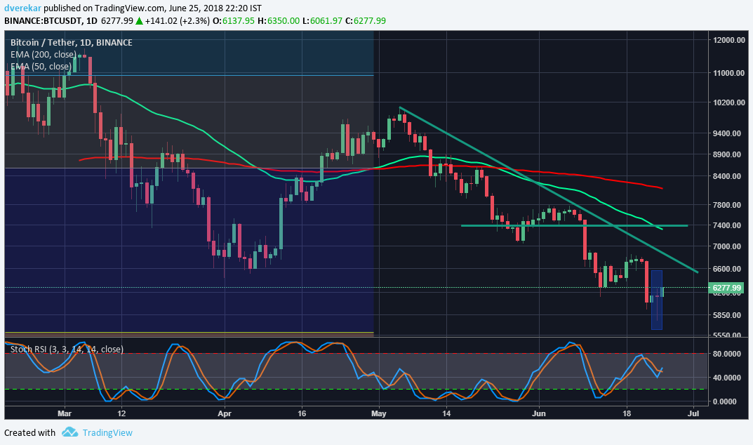 We saw BTC going to lows from 6000USD to 5750 USD, yes there is still a chance to go down further. However as of 24th June it has reached 6250 USD and as per the pin bar created at the days end, the Bullish sentiment is greater even though we are facing a Bearish structure.