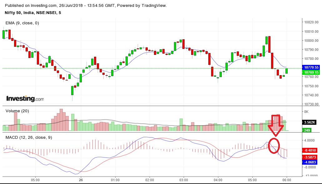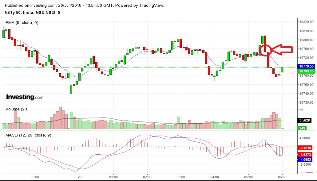 Today market opened at 10,740.05 and made day low of 10,733.05 and it was in bearish mode only. After that, in afternoon it made high of 10,805.05 (10,800 seemed to be resistance today and it broke resistance which was false breakout as I explained in my last video) and closed at 10,769.15