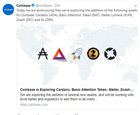 Source of the information: https://blog.coinbase.com/coinbase-is-exploring-cardano-basic-attention-token-stellar-zcash-and-0x-9e44f0eb823f