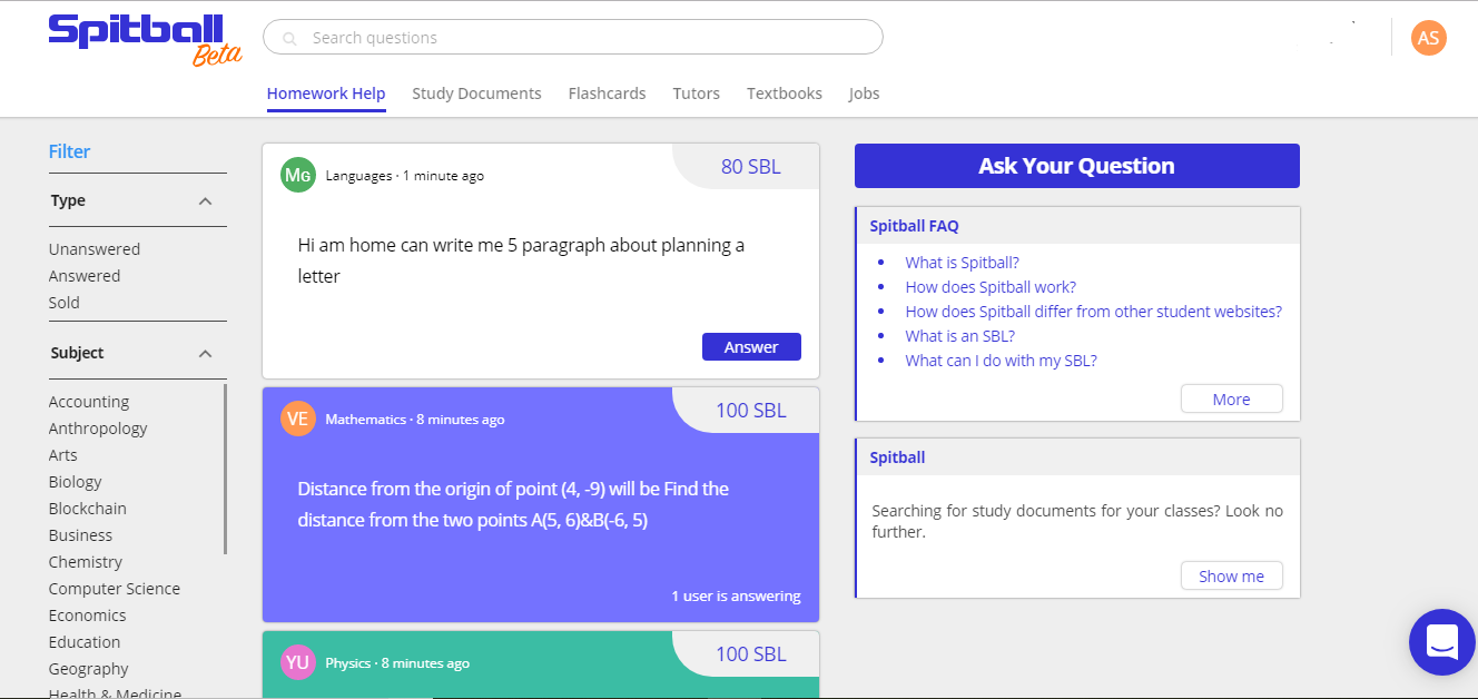 The website name is Spitball. Here, you will find lots of topics like History, Maths, Science, Blockchain etc. You have to select the topic of your choice and you will find the questions over there. Other members of Spitball offer some amount of SBL tokens in exchange of correct answer. If your answer is selected by the person asking the question you will get the tokens.