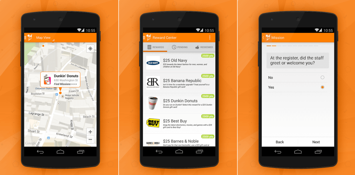 The app displays Missions on a map view for you to find a nearby assignment. Once you’ve completed it, the team manually checks the submission and then credits you the points, which can be exchanged for gift cards, cash or other rewards.