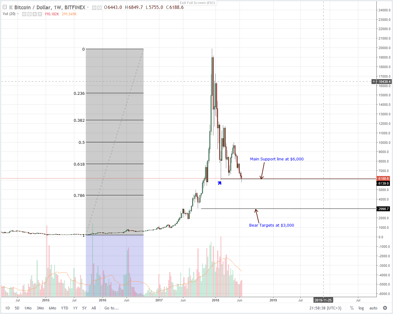 In my view, the combination of fundamental events and talks or regulation would be the main undoing for BTC valuation. As such, until we have clarity, Bitcoin will continue to haul other coins with them. In the weekly chart, the first region of support in-case we see a follow through this week stands at $4,500 or the 78.6 percent Fibonacci retracement line. If there is a further break down, then aim for $3,000 as laid down before.