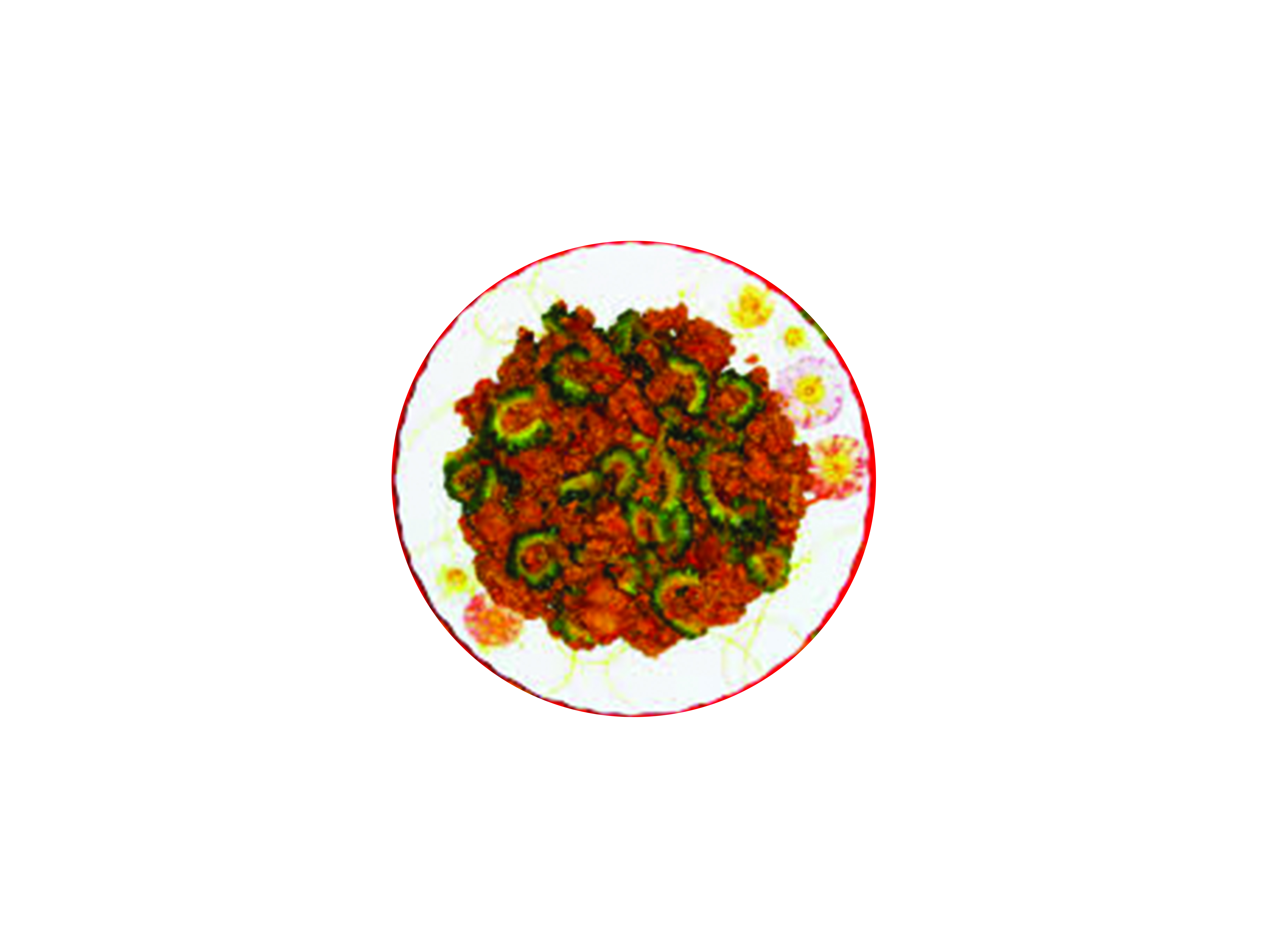 Put tomatoes' pepper hot spices' Red Peppers' black Pepper 'Green coriander' and Fry bitter gourd in 5 minutes for her.
