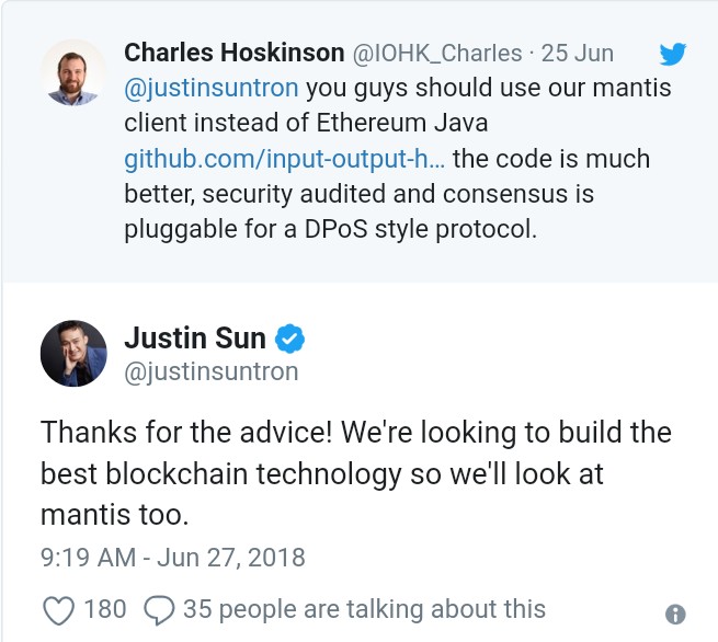 Recently we have been with the news of CARDANO(ADA) ask Justin sun (Tron ceo) to use there mantis client instead of ethereum Java