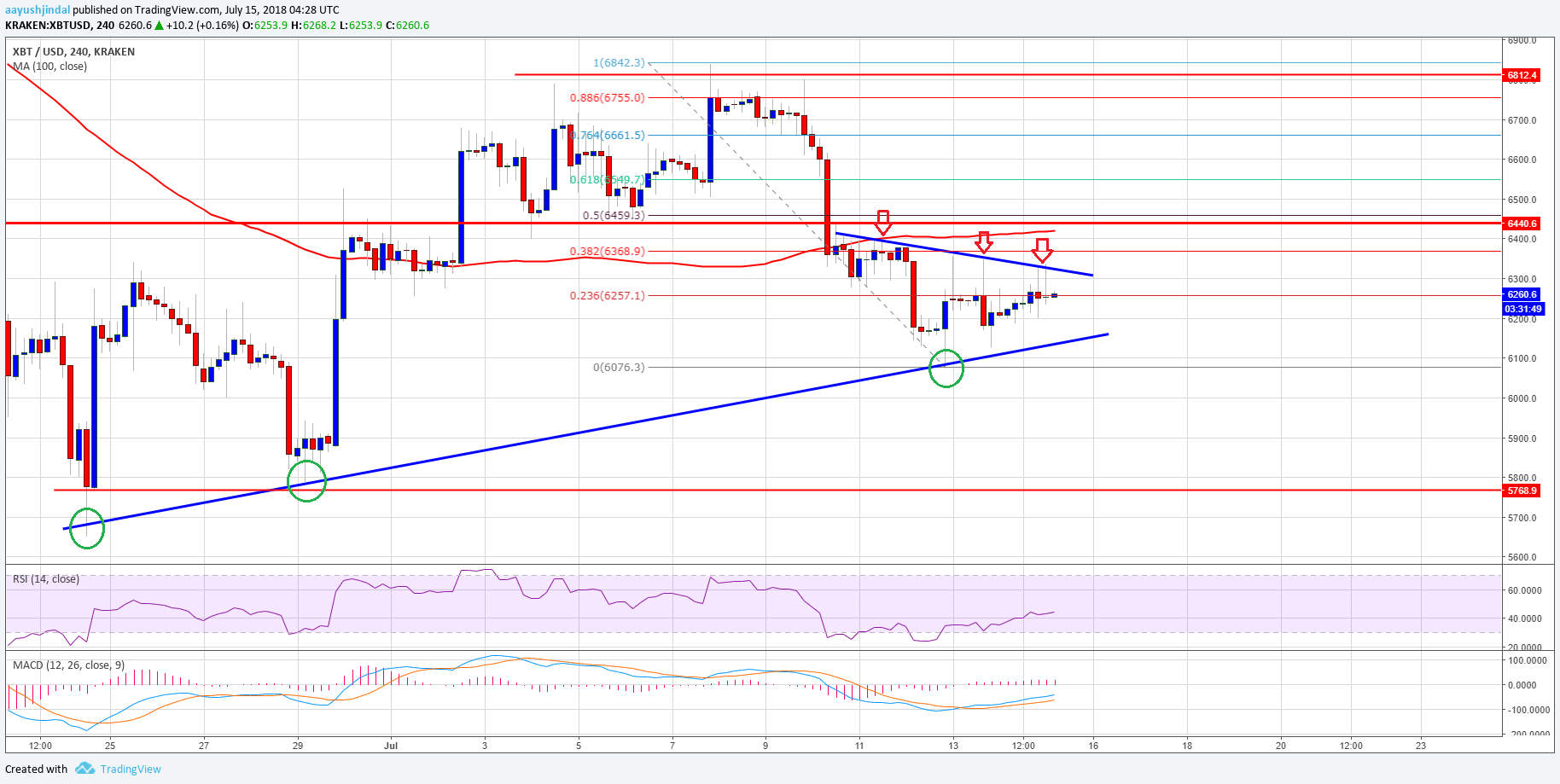A low was formed at $6,076 and the price started an upward correction. It moved a few points above the 23.6% Fib retracement level of the last decline from the $6,842 high to $6,076 low. However, the upside move was prevented by the $6,360 level. More importantly, there is a key triangle forming with resistance near $6,300 on the 4-hours chart of the BTC/USD pair. Above the triangle resistance, there is a crucial resistance near $6,440, which is near the 100 SMA. Moreover, the 50% Fib retracement level of the last decline from the $6,842 high to $6,076 low is at $6,459. Therefore, the $6,450-60 zone could act as a strong resistance.