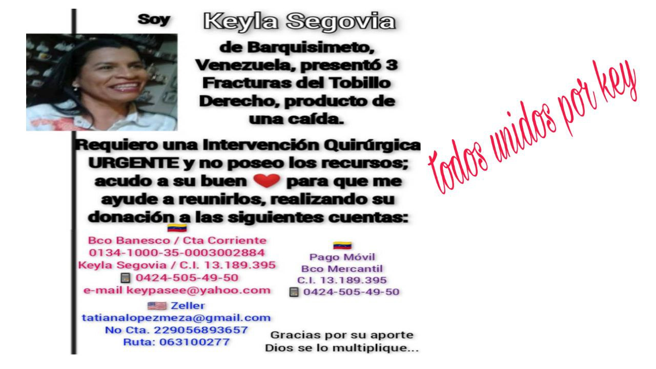 Nuestra amiga Keyla tuvo una caída cerca de su hogar dónde como resultado tiene múltiples fracturas en el tobillo, por lo que amerita una cirugía lo más pronto posible pero no cuenta con los recursos para dicha operacion y para nadie es un secreto que aquí en Venezuela ya no contamos con recursos gratis para un caso como este, y de lograr la cirugia hay que comprar todo lo necesario para ejecutarla(medicinas, kit quirurgico, etc) por lo que estamos recurriendo a ustedes y entre todos poder colaborar en algo para su pronta recuperación, no es fácil lidiar con la situación país y encima con un inconveniente de salud, es terrible algún malestar en nuestro organismo así que no puedo imaginar el gran dolor que siente nuestra amiga en estos momentos.