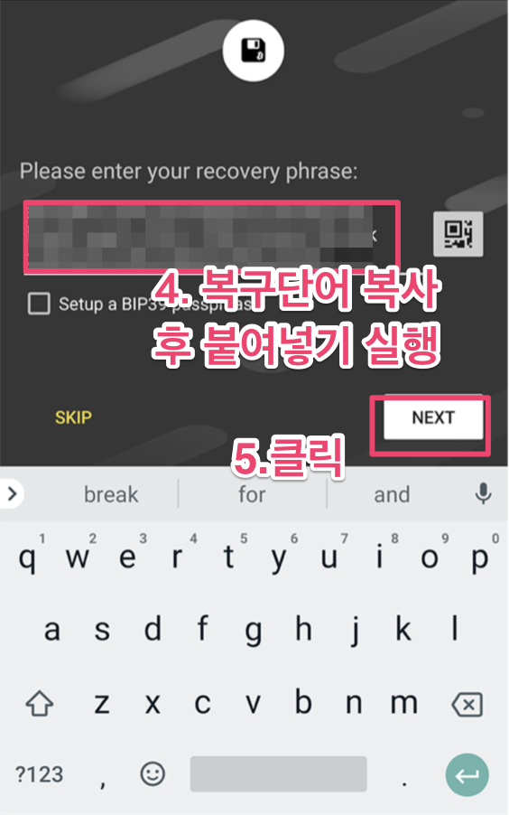 복사한 복구키를 붙여넣기 합니다. 그리고 NEXT를 눌러 다음 페이지로 넘어가주세요.