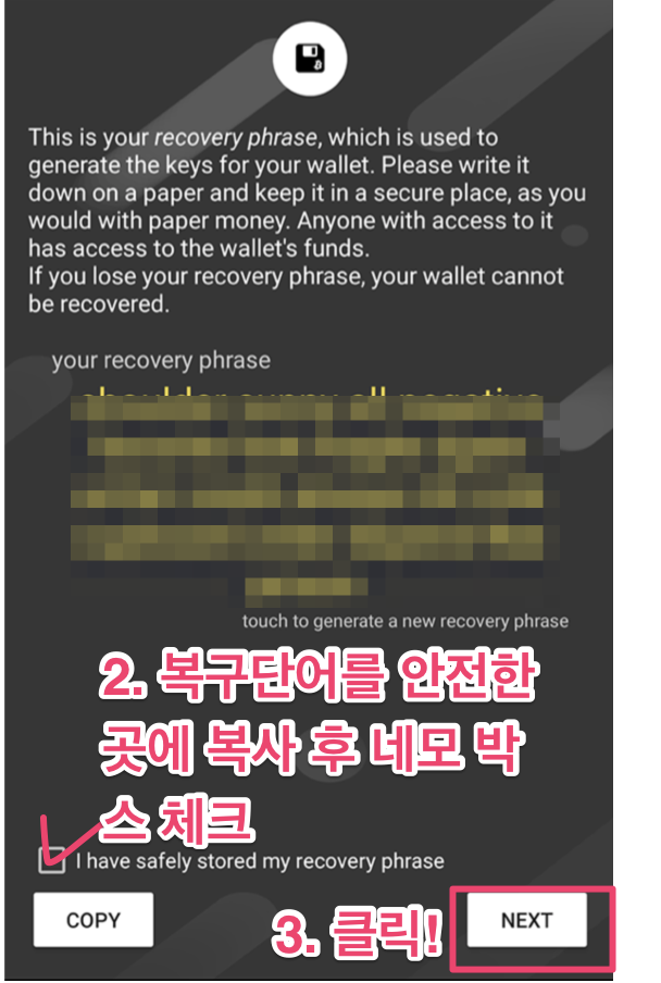 지갑을 만드는 과정에 제공되는 단어를 안전한 곳에 저장해야 합니다. 나중에 지갑을 복원할 때 필요한 개인 키입니다.