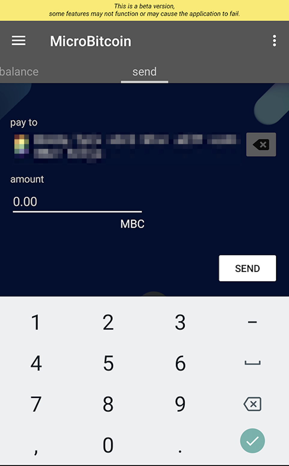 이 메뉴는 마이크로비트코인을 보낼 수 있는 송신 화면입니다.