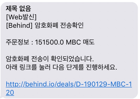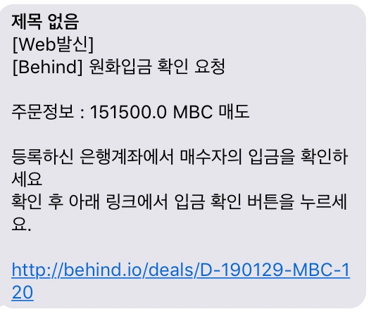 상대방이 마이크로비트코인을 받고 원화를 입금하게 되면 또 다음과 같은 문자를 받습니다.