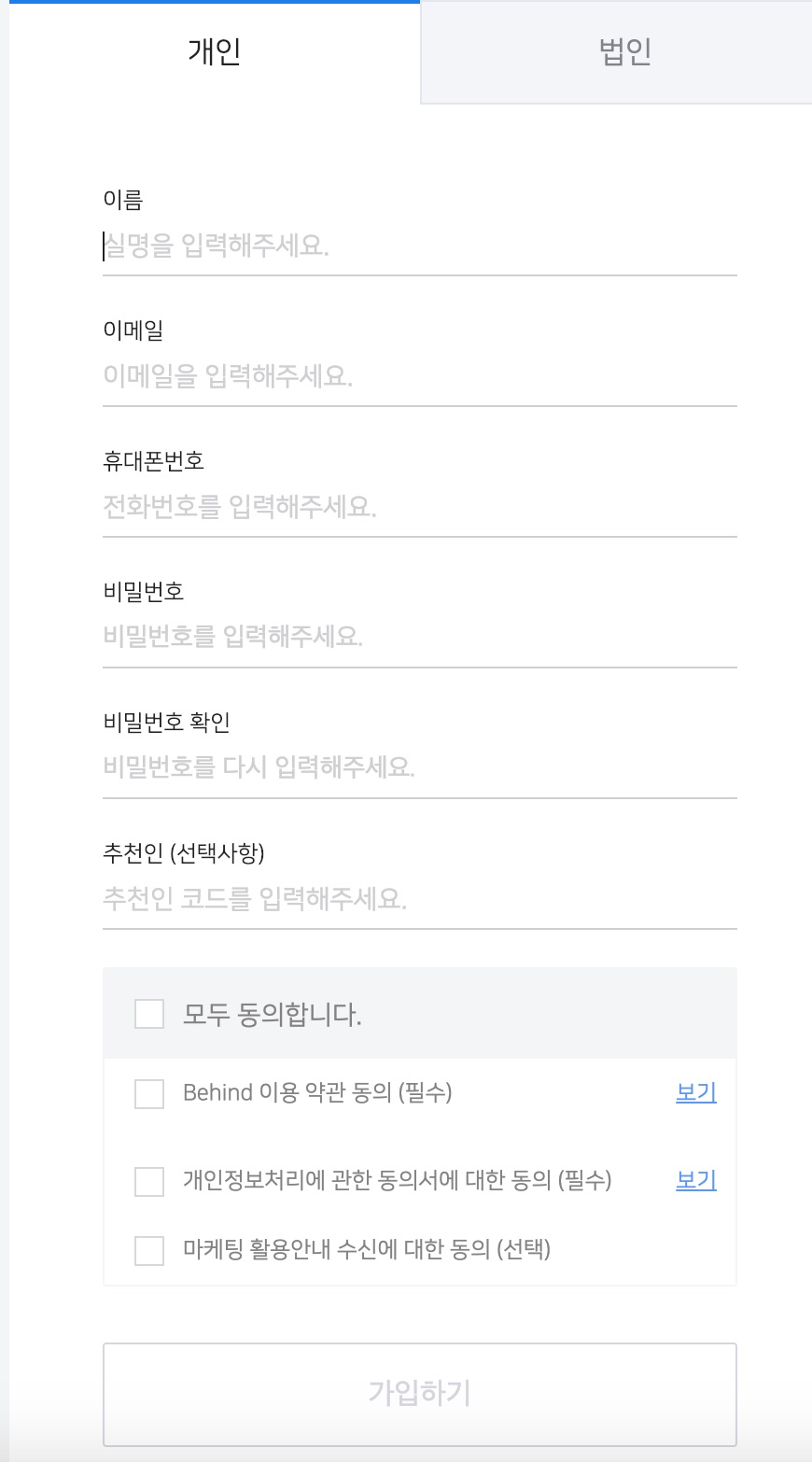 우선, 비하인드 거래소에서 마이크로비트코인을 거래하기 위해서는 가입이 필요합니다.