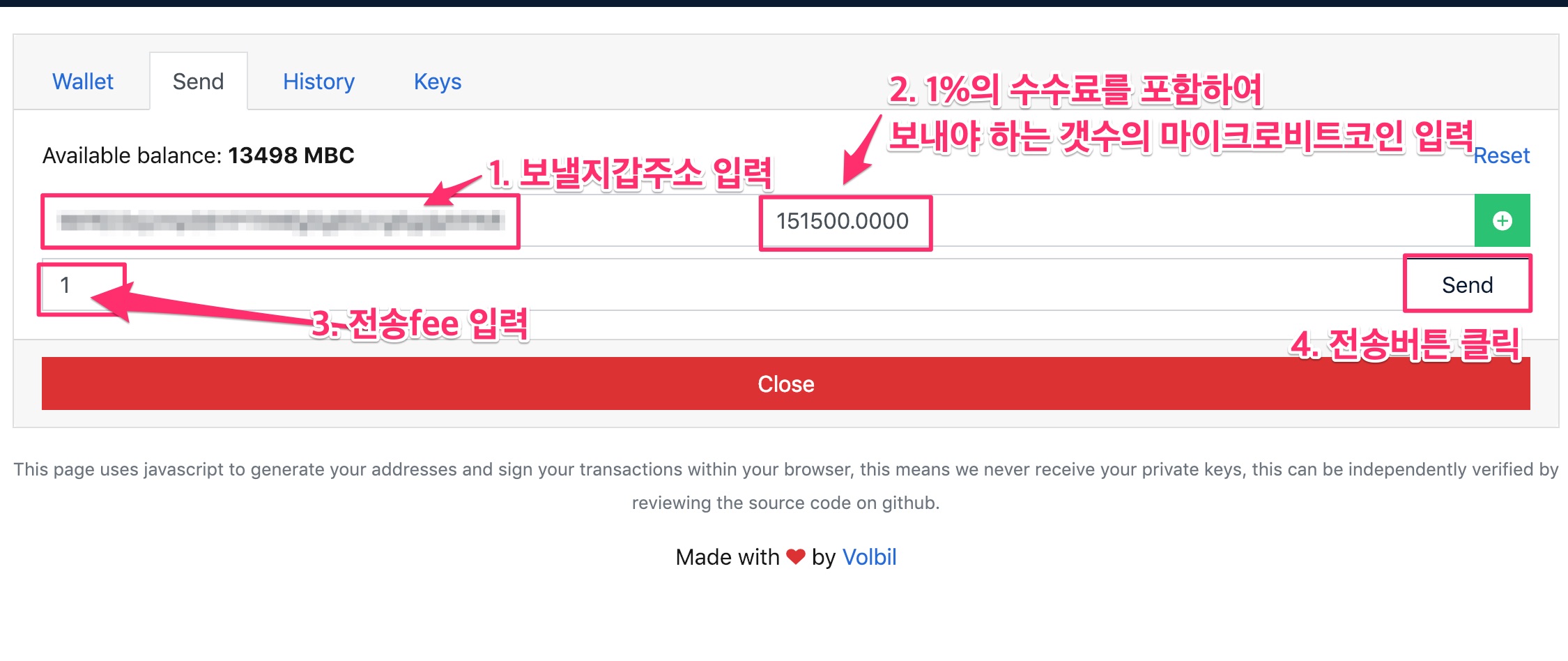 내 지갑으로 돌아가서 해당하는 갯수의 마이크로비트코인을 보낼지갑주소로 전송합니다.
