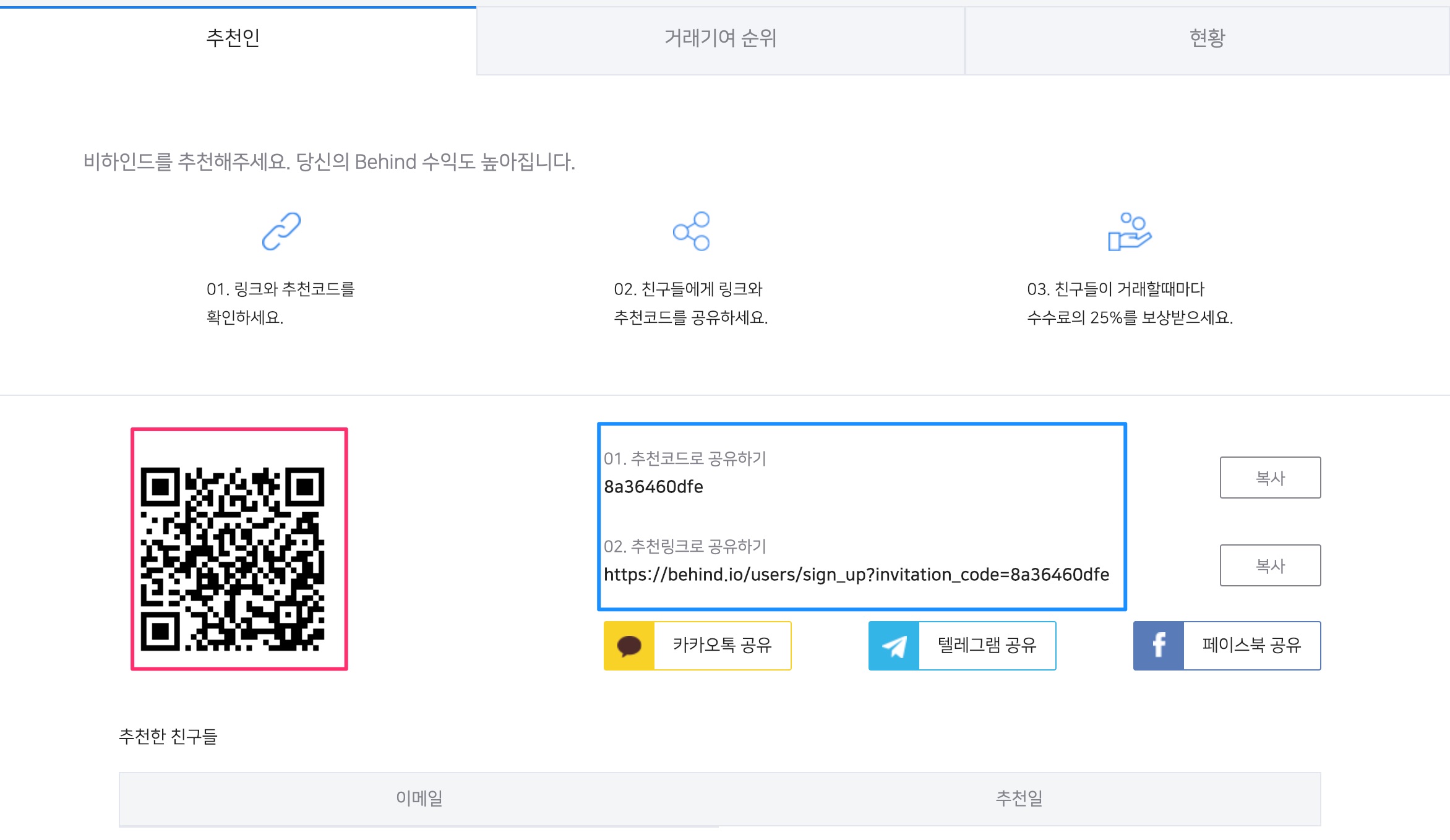 추천인 코드를 입력하면 거래자들이 거래할 때, 해당 추천인은 수수료의 25%를 보상받게 됩니다.