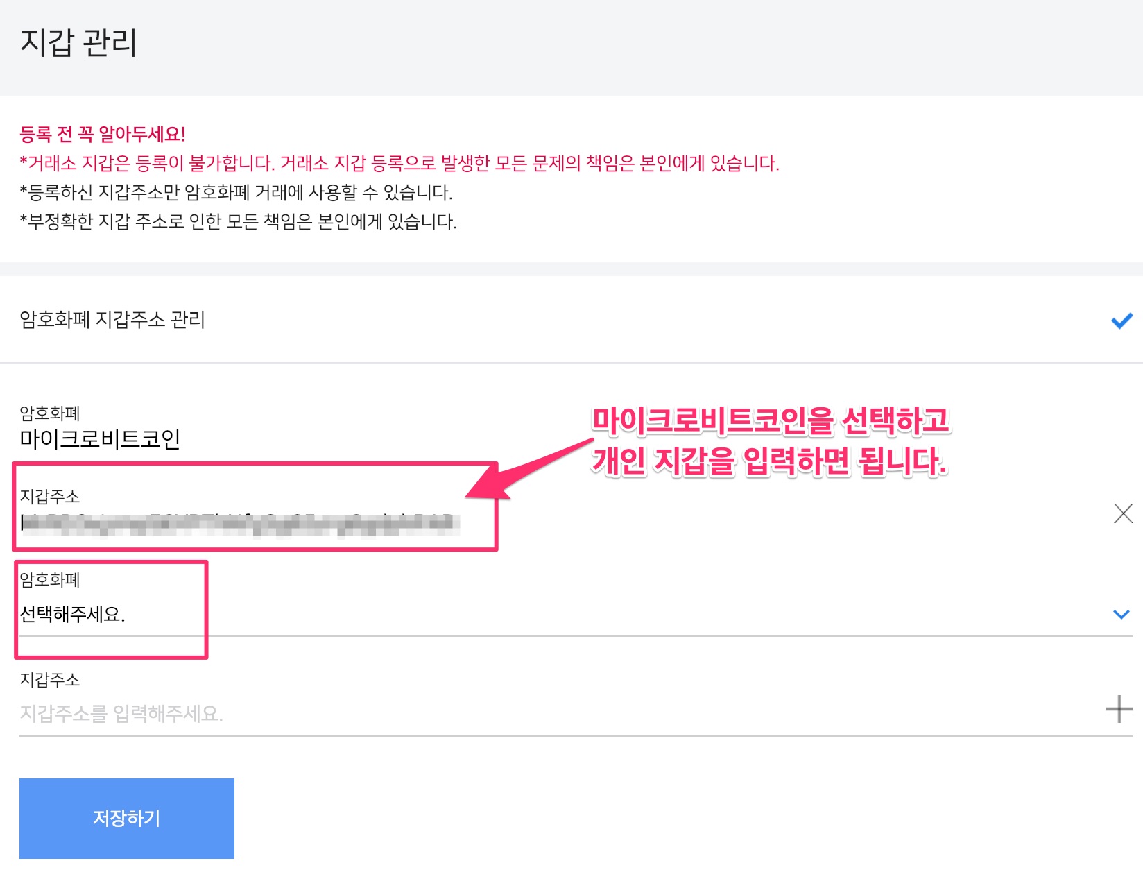 거래소 지갑주소는 절!대! 안됩니다. 웹지갑,어플지갑,종이 지갑 등 개인이 보관하는 개인 지갑의 주소를 입력합니다.
