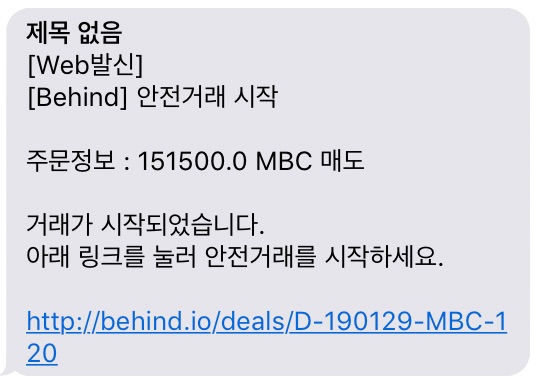 누군가 저와 알맞는 가격과 개수를 거래하고 싶다고 하면, 비하인드 거래소로부터 알림문자를 받을 수 있습니다.
