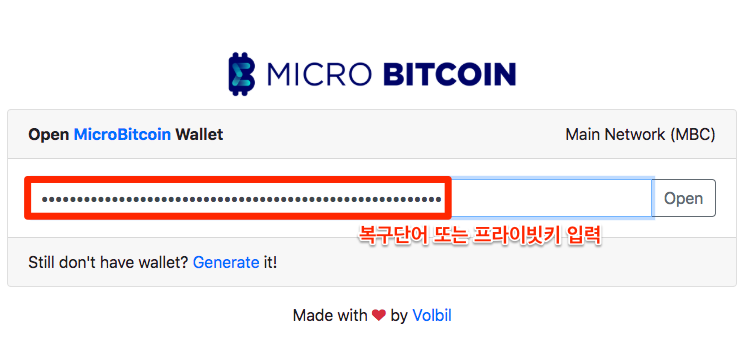 마이크로비트코인 웹지갑을 생성하였으면 웹지갑 페이지로 돌아가서 프라이빗 키를 입력합니다.