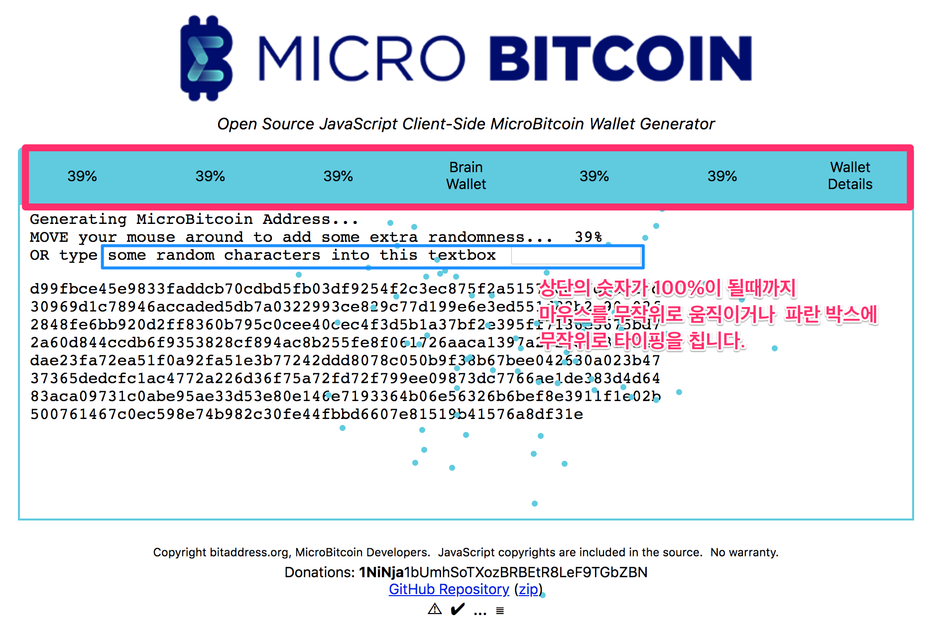 - 마이크로비트코인 지갑생성기에 접속하면 위와 같은 화면이 나타납니다.