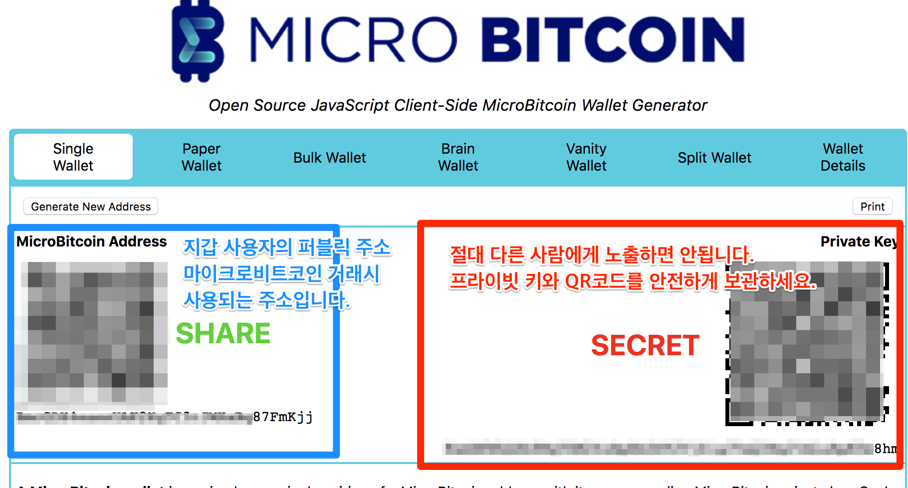 오른쪽은 프라이빗키며, 타인에게 절대로 노출하면 안됩니다. 타인에게 노출하거나 분실시에는 마이크로비트코인에 손실이 있을 수 있으니 주의하시기 바랍니다.