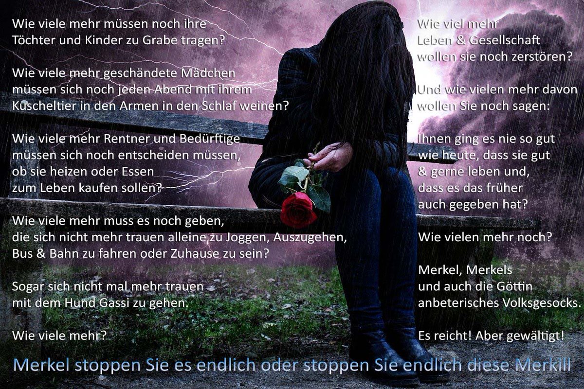 Wie viele mehr müssen noch ihre Töchter und Kinder zu Grabe tragen? Wie viele mehr geschändete Mädchen müssen sich noch jeden Abend mit ihrem Kuscheltier in den Armen in den Schlaf weinen? Wie viele mehr Rentner und Bedürftige müssen sich noch entscheiden müssen, ob sie heizen oder Essen zum Leben kaufen sollen? Wie viele mehr muss es noch geben, die sich nicht mehr trauen alleine zu Joggen, Auszugehen, Bus & Bahn zu fahren oder Zuhause zu sein? Sogar sich nicht mal mehr trauen mit dem Hund Gassi zu gehen. Wie viele mehr?