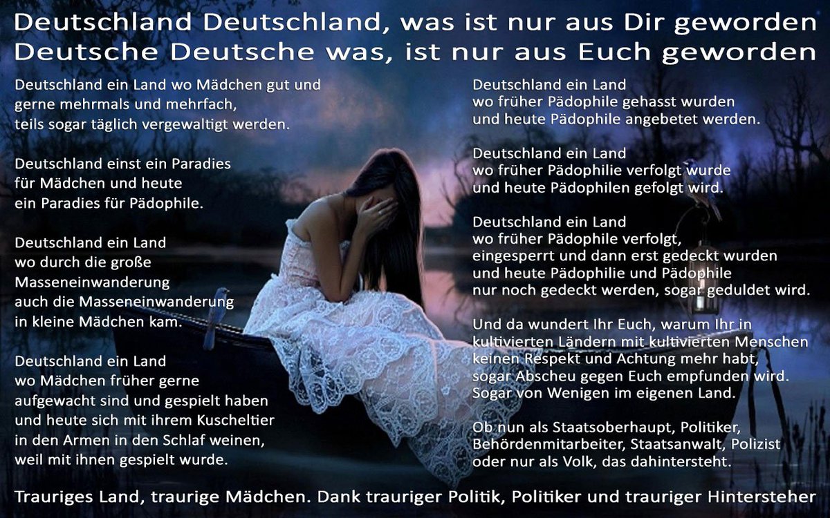 Deutschland ein Land wo Mädchen gut und gerne mehrmals und mehrfach, teils sogar täglich vergewaltigt werden. Deutschland einst ein Paradies für Mädchen und heute ein Paradies für Pädophile. Deutschland ein Land wo durch die große Masseneinwanderung auch die Masseneinwanderung in kleine Mädchen kam. Deutschland ein Land wo Mädchen früher gerne aufgewacht sind und gespielt haben und heute sich mit ihrem Kuscheltier in den Armen in den Schlaf weinen, weil mit ihnen gespielt wurde. Deutschland ein Land wo früher Pädophile gehasst wurden und heute Pädophile angebetet werden. Deutschland ein Land wo früher Pädophilie verfolgt wurde und heute Pädophilen gefolgt wird. Deutschland ein Land wo früher Pädophile verfolgt, eingesperrt und dann erst gedeckt wurden und heute Pädophilie und Pädophile nur noch gedeckt werden, sogar geduldet wird.
