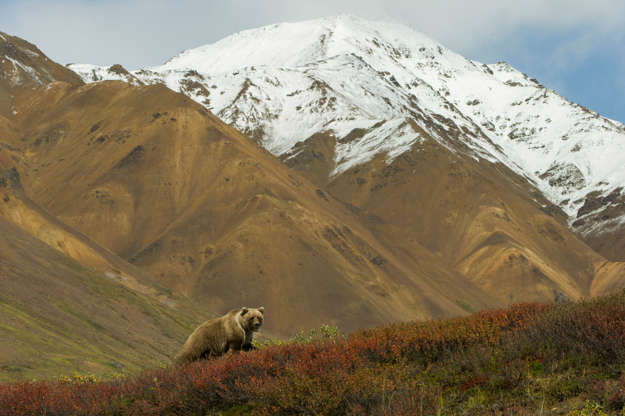 전에는 매킨리 산이라고 불렸던 데날리 산은 해발 6,000미터(19,685피트)로, 북아메리카에서 가장 높은 봉우리입니다. 데날리 산은 데날리 국립공원의 중심부에 있으며 24,281제곱킬로미터(6,000,000에이커)의 자연 보호 구역을 보존하고 있습니다. 이 사진에서 국립공원에 서식하는 동물 중 하나인 북아메리카 큰곰을 볼 수 있습니다. 회색곰이라고 더 잘 알려져 있는 곰이죠. 회색곰은 풀, 물고기, 나방은 물론 언덕을 뒤덮은 덩굴월귤과 블루베리까지 먹는 잡식성 동물입니다. 회색곰은 뭐든지 가리지 않고 먹어서 몸을 180킬로그램(400파운드)까지 불려야 합니다. 데날리 국립공원의 겨울을 나기란 험난하거든요.